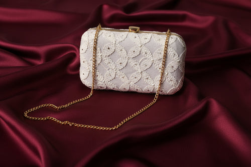 Handcrafted Chikankari Clutch/Bag with Golden Chain - White
